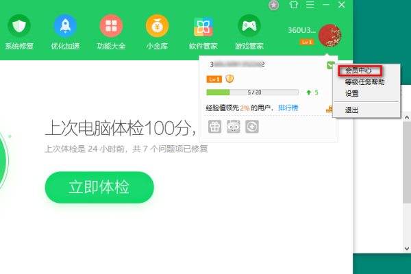 2、然后,把鼠标移动到登录账号的头像处,在弹出的小窗口中点击绿色的勾,再点击会员中心。
