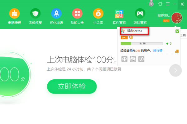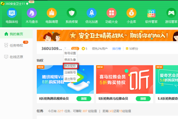 5、最后,返回到360安全卫士的主界面就可以看到账号名字更改成功了。