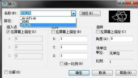 2、打开之后,运行“插入块”命令,在名称中选择“TCH_PR”,然后确定插入当图中,运行分解X命令,将块分解,即可解决图纸加密的问题。