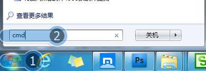点击【开始】菜单→在搜索框中输入"cmd"→按键盘enter(回车)键: