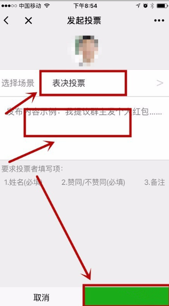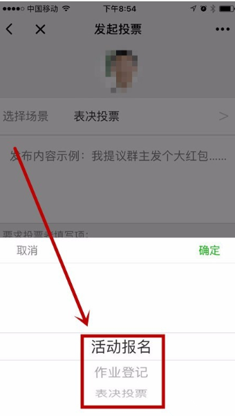3、在选择场景里有3个场景活动报名、作业登记、发表投票三个场景,以发表投票场景为例。