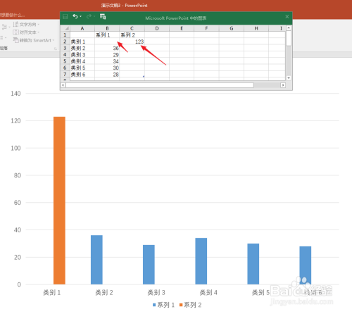在自动打开的Excel表格中输入源数据,柱状图自动生成。可以看到,大多数数据都比较接近,但是其中一个数据异常大,使得柱形很高,其余柱形的变化趋势都得不到体现。