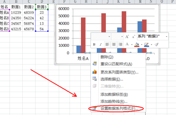 2、在图表中选中数据列小的柱形图,通过鼠标右键选择“设置数据系列格式”。