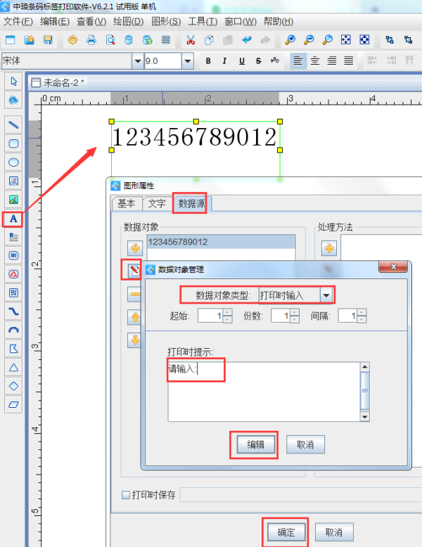 你说的这种,可以在条码标签打印软件上通过打印时输入功能来实现你想要的效果:如图,打开条码软件,绘制一个普通文本,双击普通文本,在图形属性-数据源中点击修改按钮,弹出数据对象类型,选择打印时输入,在下面的打印时提示中输入你要打印的数据,点击编辑,根据提示在输入一次你要打印的数字,然后点击确定,就可以实现你想要的效果。