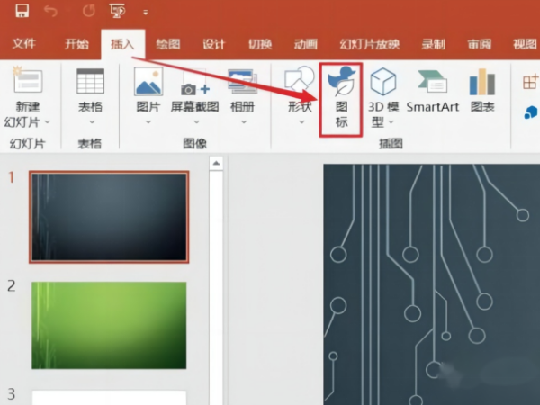 1、新建PPT文件,点击菜单栏中的“插入”,然后点击“图标”。