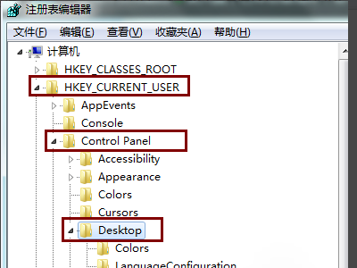 3、在注册表编辑器中打开“HKEY_CURRENT_USER→ControlPanel→Desktop”文件,如图所示。
