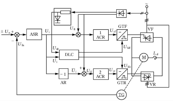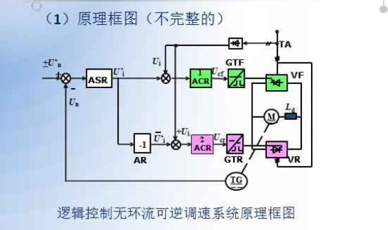 2、不能根据控制系统中的转速给定信号Vgn的极性来确定脉冲封锁的取舍。因为不只是反转时应该开放反组可控硅,在正转制动(或降速)时,也要利用反组。两种情况下,都要封锁正组,开放反组。