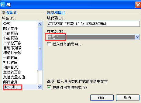 5、弹出域对话框,在域名处选择样式引用,在样式名处选择标题1;
