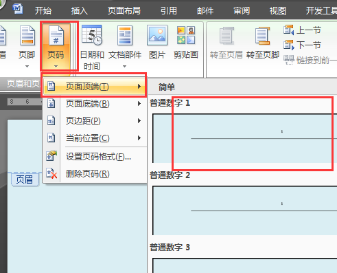 四、这里演示为页眉添加页码,点击页码—页面顶端—普通数字1。