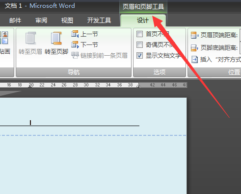 二、如下图,双击之后,进入到编辑页眉/页脚模式,并在工具栏出现设计选项卡。