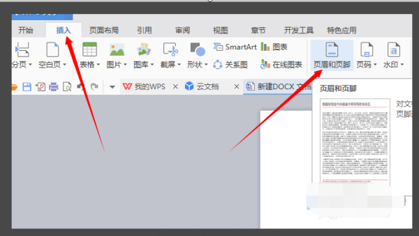 2、在工具栏点击插入按钮,会出现“页眉和页脚”按钮选项,点击即可;