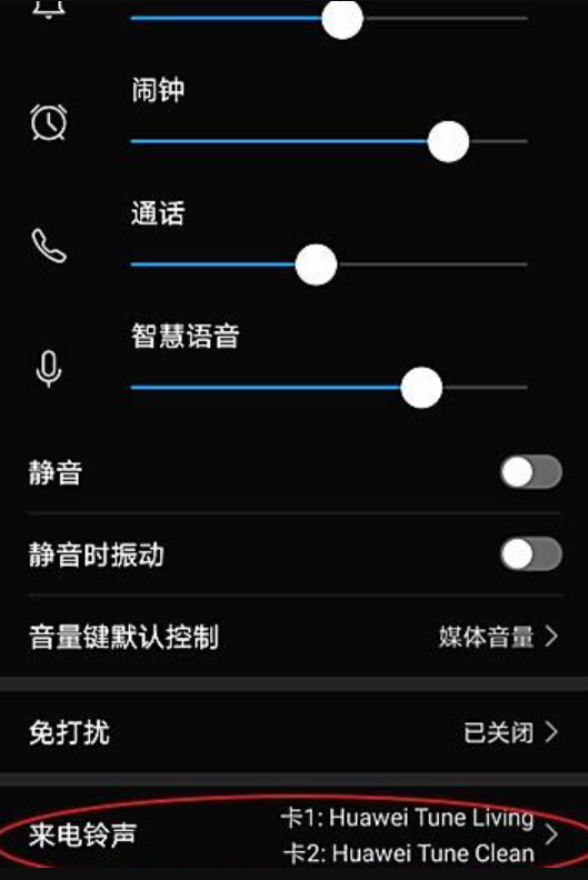 3、下滑页面,找到【卡1来电铃声】和【卡2来电铃声】。