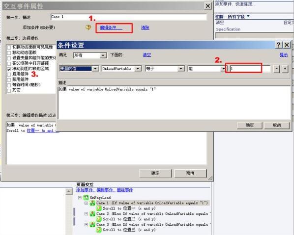 3. 在到达页Page1中设置好位置一、二、三的图片映射区域后。在Page1页“OnPageLoad”中加交互。如图: