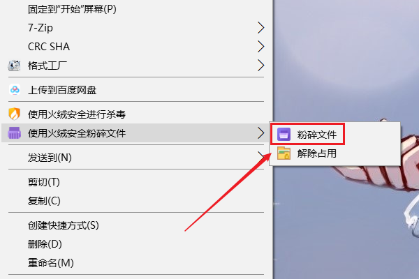 4、在鼠标右键菜单中,点击火绒安全粉碎文件。