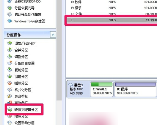 1、左键点击要转换成逻辑分区的主分区磁盘,如: I:/磁盘,再点击分区助手对话窗口左侧的分区操作下的转换到逻辑分区。
