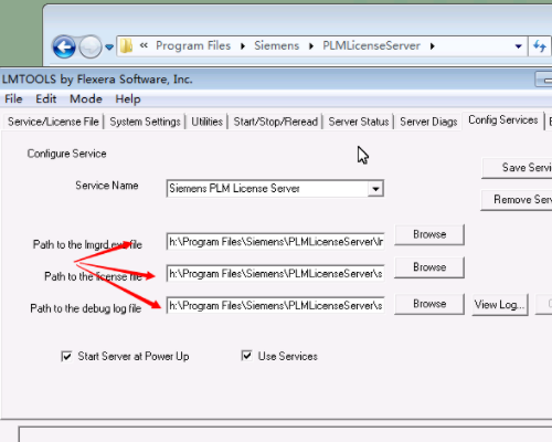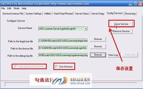 在保存之前,先勾选下面的两个选项,一个是 use services(使用该服务器)另一个是strat server at powerup,勾选了第一个,这个就可以勾选了(他的意思是,下次启动计算机是自动运行该许可证服务器)