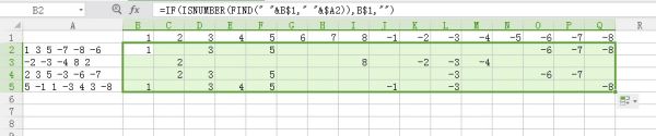 B2单元格输入公式=IF(ISNUMBER(FIND(" "&B$1," "&$A2)),B$1,"")