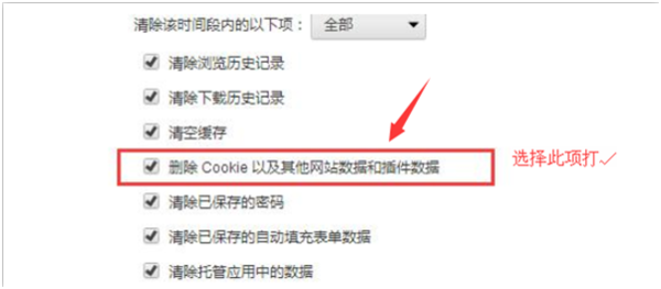 6、在“清除该时间段内的以下项”中,选择“删除cookie以及其他网站数据和插件数据”。