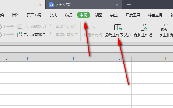 2、点击工具栏中的审阅,然后点击撤销工作表保护。