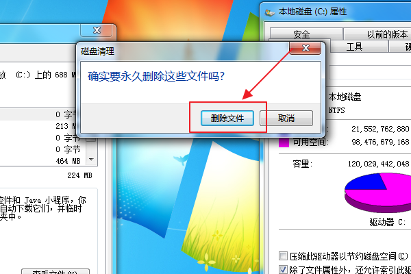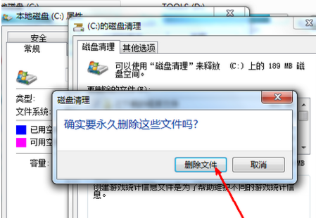 5,然后点击确定,在弹出的“磁盘清理”点击“删除文件”即可。