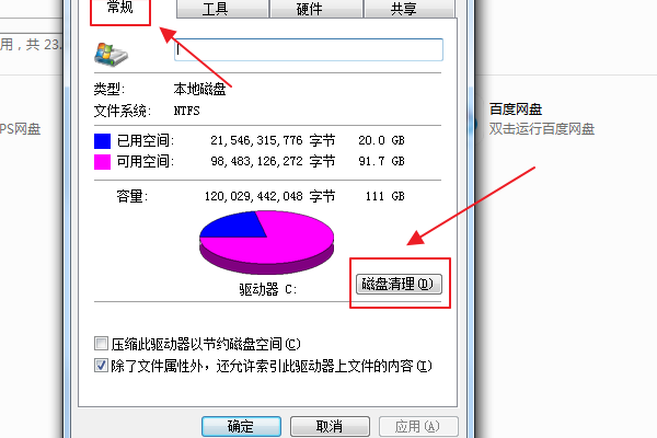3、在弹出C盘属性对话框,切换至常规页签点击磁盘清理按钮。