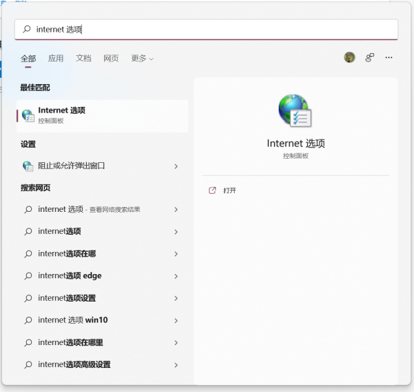 四、点击WIN键输入internet 选项,点击internet 选项