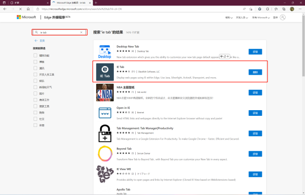 二、进入页面后在搜索框中输入ie tab进行搜索,找到图中标红插件点击获取