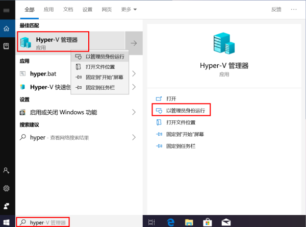 左下角搜索框搜索并选择【Hyper-V管理器】【以管理员身份运行】,即可进入“Hyper-V管理器”创建虚拟机。