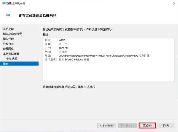 “摘要”将显示当前选择的步骤,点击【完成】,等待虚拟机创建完成。