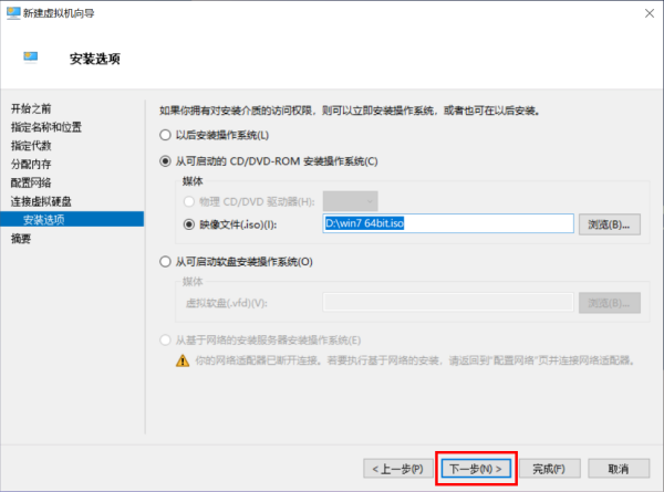 在“安装选项”点选【镜像文件(.iso)】浏览并导入操作系统ISO镜像文件,直到【完成】并进入安装虚拟机操作系统界面。也可以选择【以后安装操作系统】或者其它方式安装操作系统。