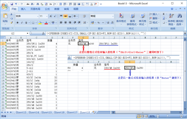 另,如果将公式中的区域“C2:C23”改成“C1:C23”,显示的结果则为业务员 北 的第一个型号“160/3J Ie250 ”
