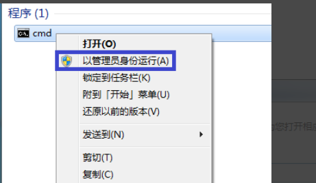 4、点击键盘上Windows徽标键。 输入“cmd”并在上方弹出的图标上点击鼠标右键,点击“以管理员身份运行(A)”。