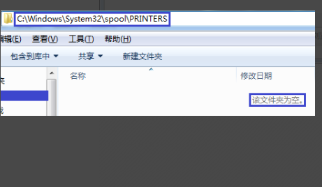 6、 打开“C:\WINDOWS\system32\spool\printers\”(本例中系统安装C盘),并删除里面所有文件及文件夹。