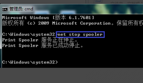 5、在管理员模式命令行下输入“net stop spooler”并按回车键,停止打印服务。