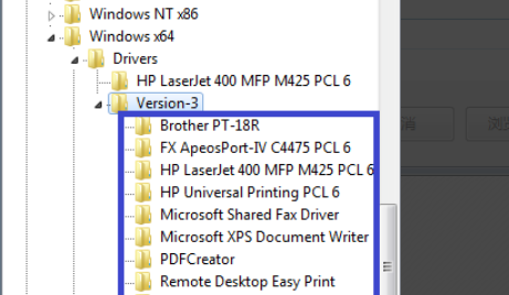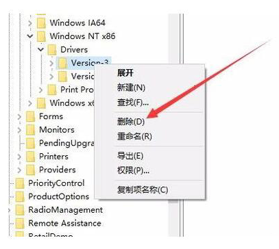 3、依次点击打开“HKEY_LOCAL_MACHINE\SYSTEM\CurrentControlSet\Control\Print\Environments\Windows x64\Drivers\Version-3”,删除所有子项(下图蓝色框内部分)。