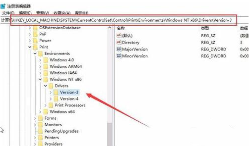 3、在打开的注册表编辑器窗口中定位到HKEY_LOCAL_MACHINE\SYSTEM\CurrentControlSet\Control\Print\Environments\Windows NT x86\Drivers\Version-3,如果您是64位系统的话,需定位到:HKEY_LOCAL_MACHINE\SYSTEM\CurrentControlSet\Control\Print\Environments\Windows x64\Drivers\Version-3