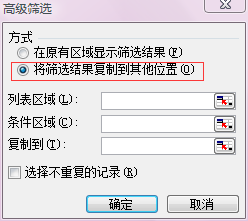 2、在弹出的对话框中,选择将筛选结果复制到其他位置;