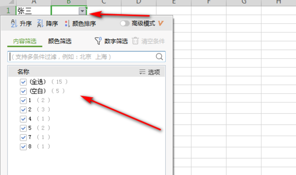 4、过滤数据后,单击右上角的小三角形选择所有表单。