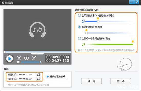 在“音频”面板点击“添加音频”按钮,在弹出的下拉框中,根据需要选“添加音效”或“添加背景音乐”,在弹出的文件选择框中,选择要添加的音频文件,进入“预览/截取”对话框,截取音频片段,在“以上音频将被默认插入到:”栏目,选择需要的选项 。