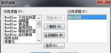 2、双击音频文件,在弹出的“音乐和声音”选项中,选择“音频滤镜”,在弹出滤镜设置对话框中选中“删除噪音”,然后单击“添加”按钮,将滤镜添加到右侧列表框内。
