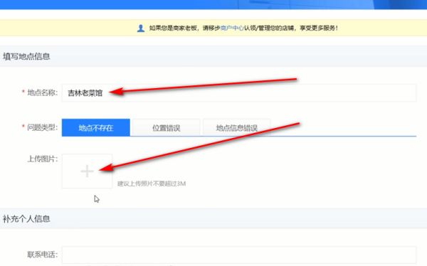 5、进入“新增商户”根据要求添加地点名称就是店名、添加照片添加店面门头照片或者店面照片;详细信息里可以添加电话,联系方式添加有效的手机号,因为高德地图那边的审核人员会打电话确认。