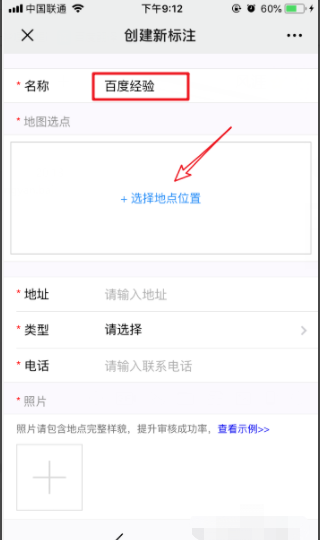 5、进入创建新标注后,核对自己的商铺名称,然后点击选择地点位置,如下图所示。