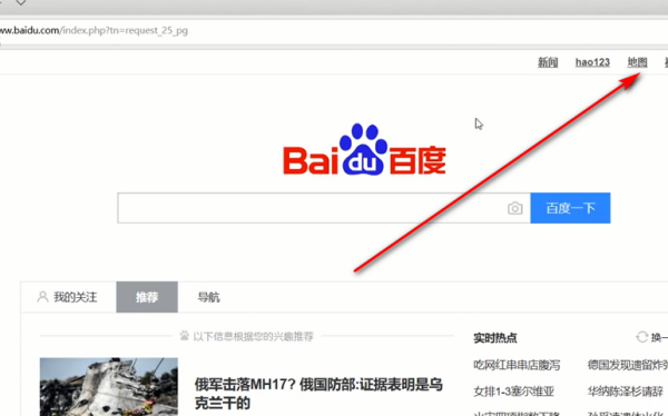 1、首先打开百度,在右上角的工具栏中找到“地图”选项打开,如下图所示。