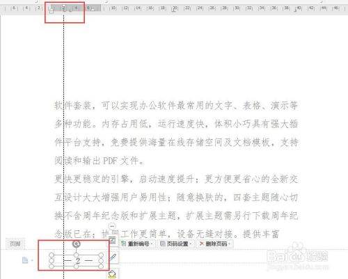 9、点击选中单页页码,使用左键将页码往前移动,移至正文最后一个字前面即可,可借助标尺查看移动位置,达到单页页码右空一字效果。