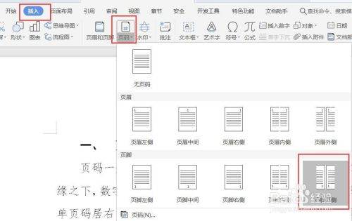 5、点击“插入”-“页码”-“页脚外侧”,插入页码。