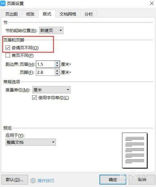 3、点击页边距设置窗口“版式”一栏,把页眉和页脚设置为奇偶页不同。