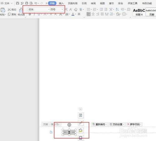 8、双击鼠标左键,并选中页码及左右一字线,将字体设置为4号仿宋字体。