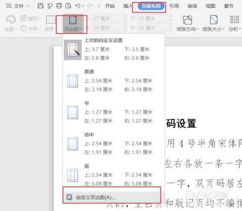2、点击“页面布局”-“页边距”-“自定义页边距”打开页边距设置窗口。