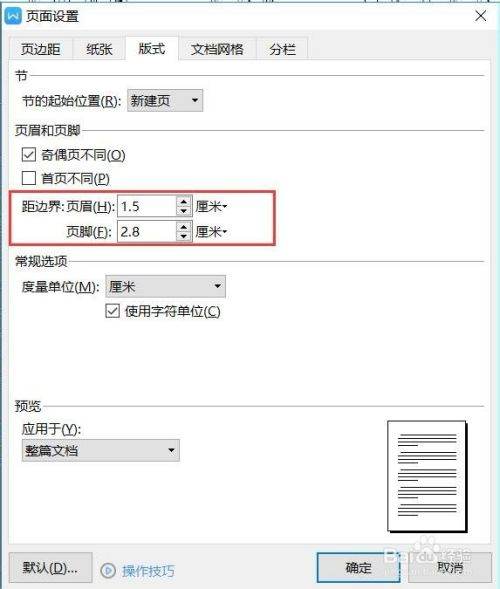 4、设置距边界,页眉设置为1.5厘米,页脚设置为2.8厘米,设置完毕后就完成了党政机关公文格式(GB/T 9704-2012)页码一字线上距版心下边缘7mm”的标准设置。