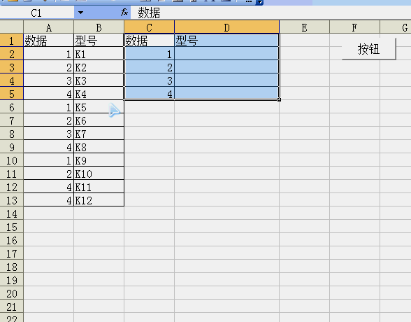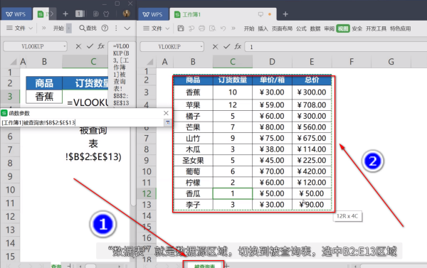 4、“数据表”就是数据源区域,这里先切换到被查询表,再用鼠标选中B2:E13区域。
